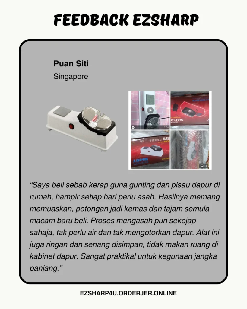 Pengasah pisau elektrik moden – tajamkan pisau & gunting hanya dalam 1-2 minit tanpa tenaga berlebihan! Dengan teknologi batu asah berlian & reka bentuk pelindung, EzSharp bukan sekadar pengasah biasa – tetapi penjaga pisau agar kekal tajam, tahan lama & selamat digunakan.